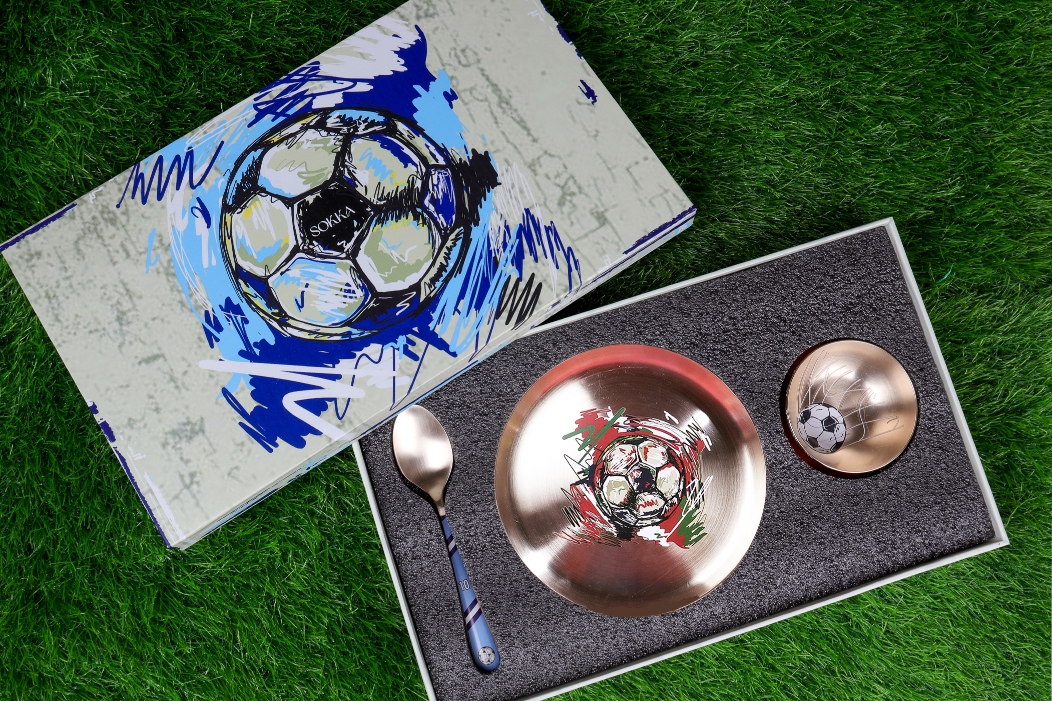 Simple, stylish, and sporty, this 3-piece set includes a side plate, small katori, and spoon ? perfect for quick meals and snacks. The design pays tribute to football heroes worldwide, making it a special pick for young fans. Made from pure kansa, the metal of health and tradition, it naturally alkalizes food and aids digestion, encouraging healthy eating habits for kids. With FDA-certified, lead-free colours, it combines safety, wellness, and football spirit in one unique set.
